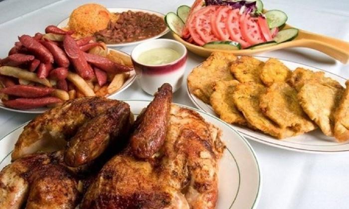 1 whole mama juanita's rotisserie chicken, served with #1 yellow rice, #2 red beans, #3 tostones, #4 salchipapa & #5 avocado salad
